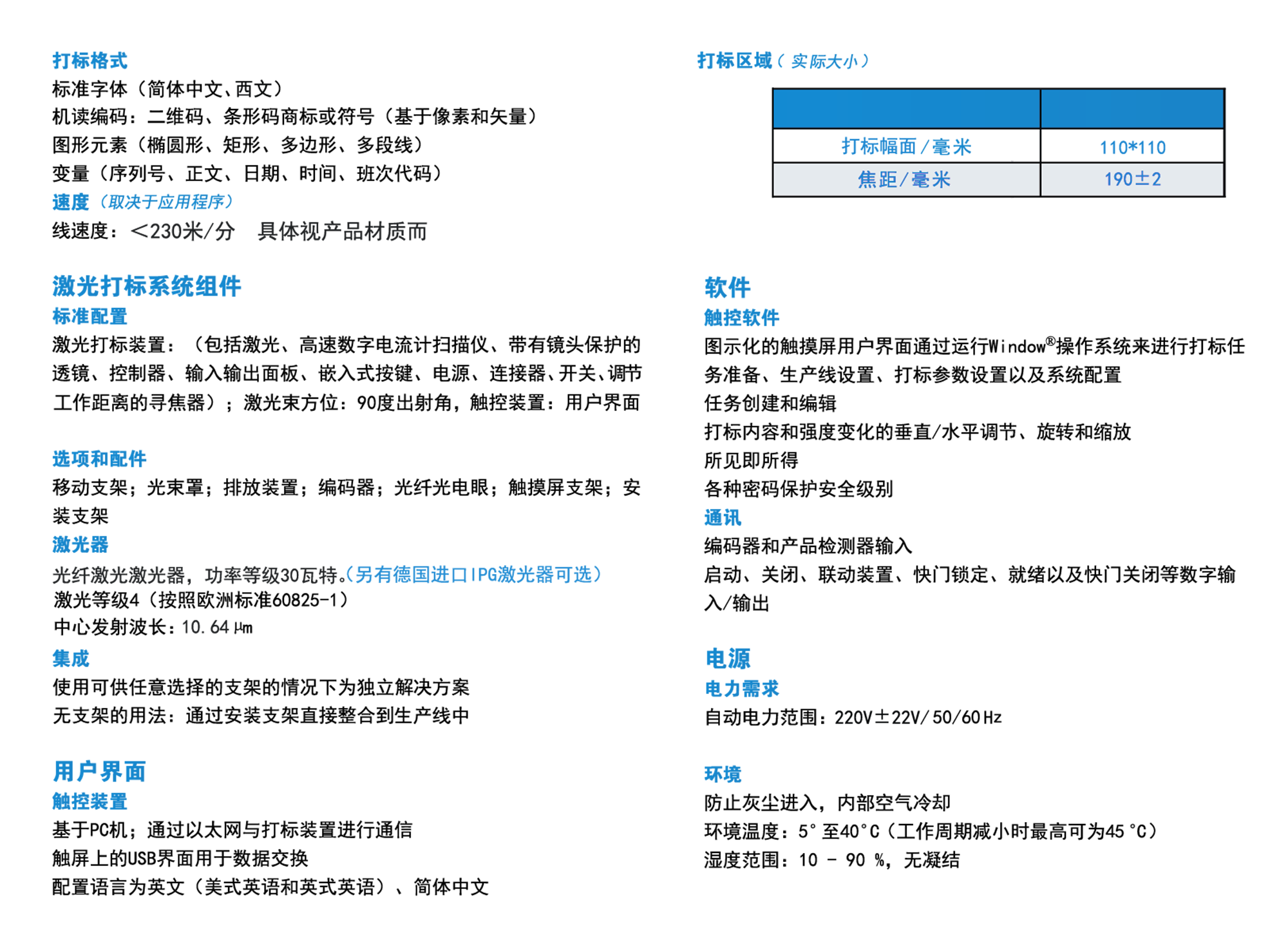 移动支架便于灵活安装,产品检测器和寻焦器超大的工作区域能够实现各种代码标识。